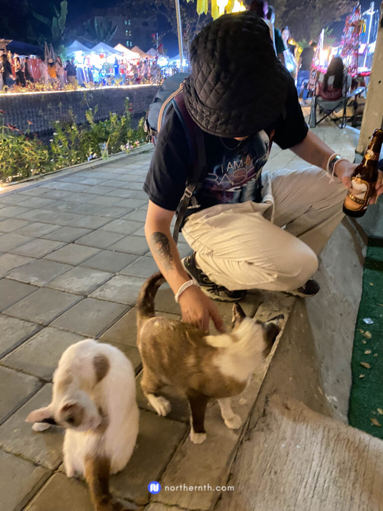 เราเดินจนมาถึง สะพานแม่ข่าระแกง เป็นจุดเริ่มต้นของที่เที่ยวยอดฮิตอย่างคลองแม่ข่า เชียงใหม่ อย่างที่บอกเที่ยวตอนกลางคืน จะได้ฟิลประดับประดาด้วยไฟ และโคมไฟล้านนา สวยมาก ระยะทางเดินตามสองฝั่งแม่น้ำไปกลับประมาณ 1 กม. สองฝั่งแม่น้ำจะมีร้านขายจะมีร้านขายของฝากต่างๆ และไฮไลค์สำหรับเราคือ น้องแมวมาให้จับฟินๆ อีกหนึ่งไฮไลค์คือ เบียร์เชียงใหม่ จะรออะไรหล่ะซดครับ เดินสักพักก็ตัดสินใจซื้อสร้อยเงินเป็นของขวัญวันเดิน และ ผ้าซิ้นเหนือเป็นของฝากให้แม่ ไว้ใส่ไปทำบุญ